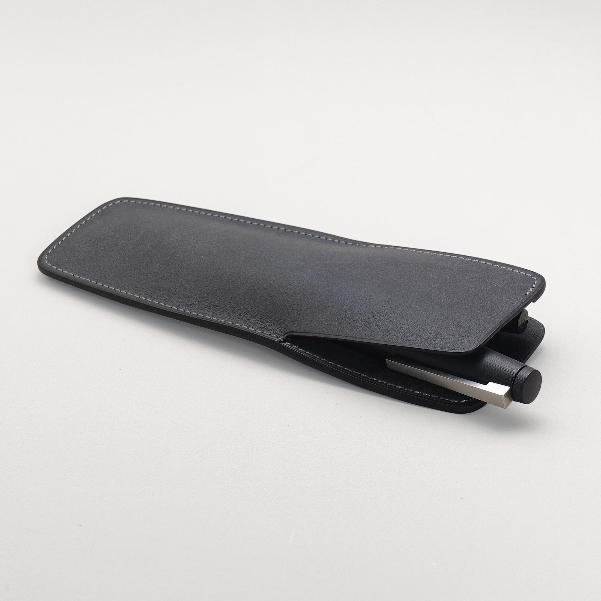 Duo Pen Sheathは上着の胸ポケットやバッグの隙間にすっと差し込める薄く小振りなサイズ。ユニークなZ構造による仕切りを採用することで、一般的な並列の2本挿しタイプでは収納する中身に対して必要以上に大きくなりがちな横幅を最小限に抑え、それぞれの筆記具を保護する姿は理にかなった必然の形です。