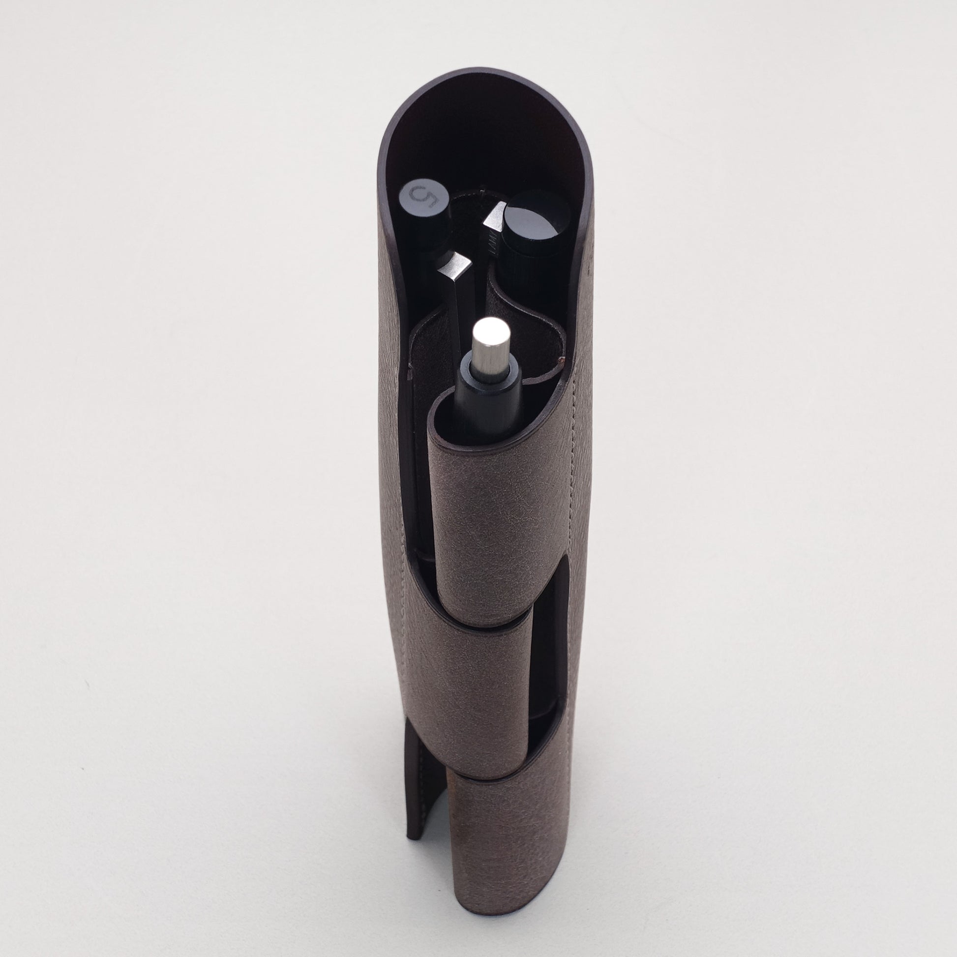 日頃から使用頻度の高いペンを外側のスリーブに挿しておくことで、左右から合わさる留め具の役割を果たしつつ、使いたい時にさっと取り出し、使い終わったらさっとしまうという素早い動作が可能に。内側のペンを取り出したい時は、外側のペンを抜き開くと、内側のスリーブがあらわれます。ここはペンどうしによる擦れや傷を防ぐために2列に仕切られ、スリーブ幅も外側よりも広めなので太軸のペンにも対応しています。