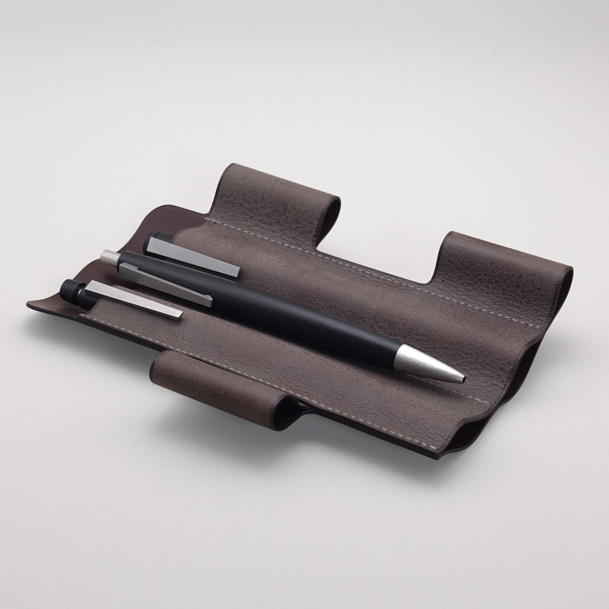 収納できる筆記具は外側スリーブは軸径が13mm、長さが145mm、内側スリーブは軸径が15mm、長さが145mmくらいまでが目安です。サンプル画像はラミー2000シリーズですが、万年筆ならペリカンスーベレーン800やモンブラン146などの中型クラスまでを2本揃えて挿せます。(ペリカンスーベレーン1000やモンブラン149などの軸径の太いペンには対応していません。)