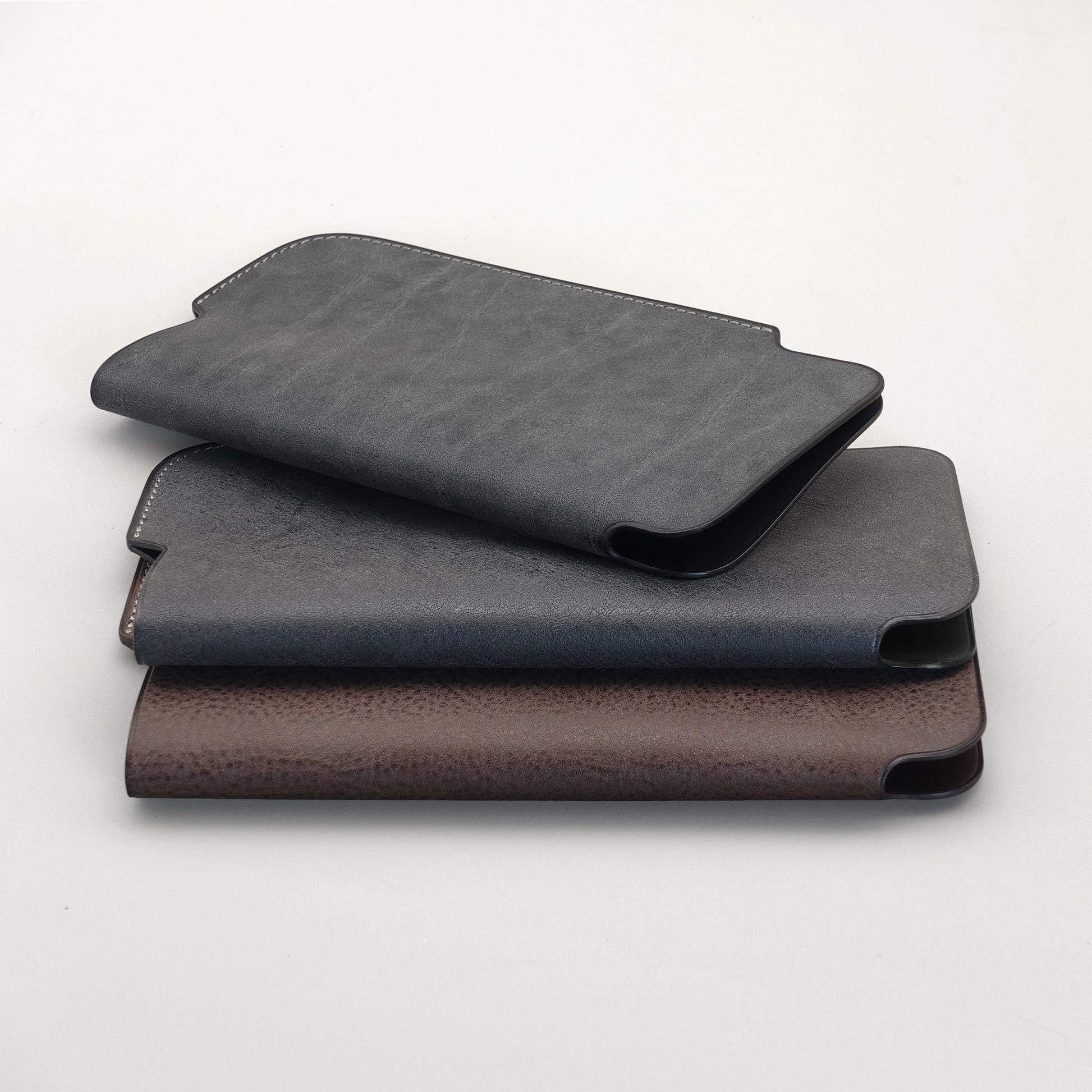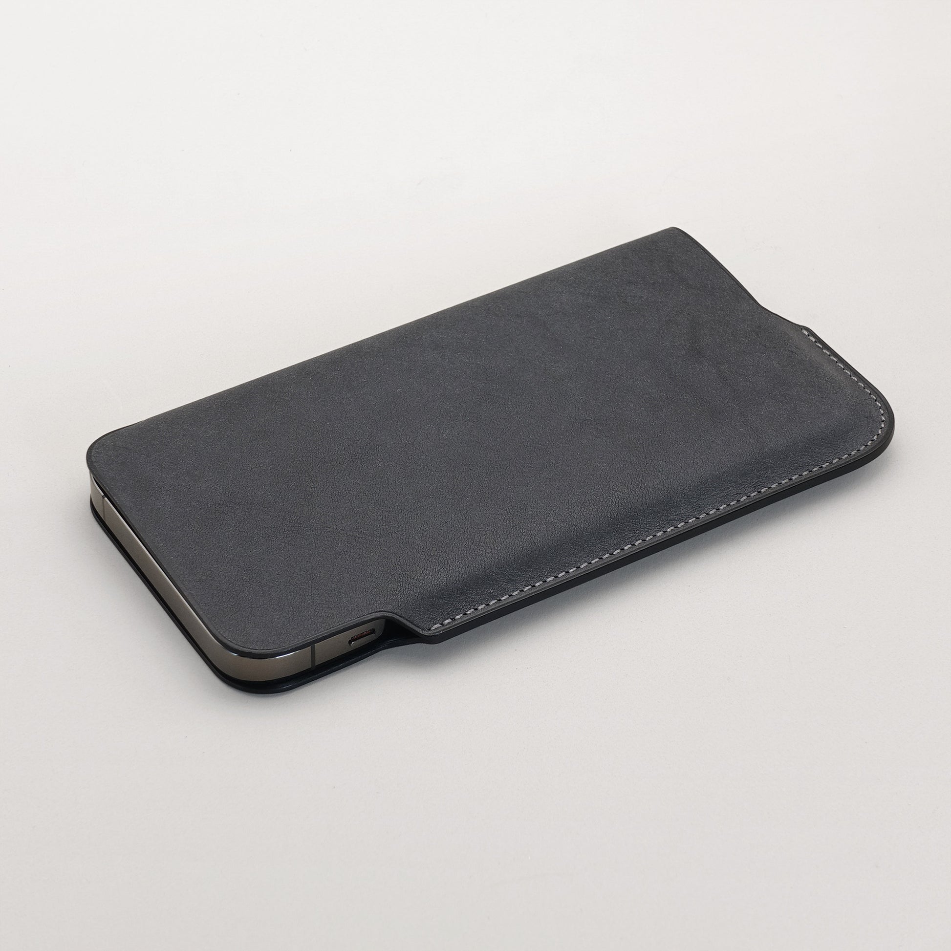iPhone 本体側面のマナーモードスイッチの配置に合わせ、スリーブに入れた状態で操作がきちんとできる独自の形状。下部の開口部はぴったりフィットする iPhoneを下から押し上げ、スムーズな取り出しをサポートするとともに、隙間からはクリアな着信音も響きます。これらはいずれも理にかなったディティールであり、本体をしっかり保護しつつ操作性を優先した必然のかたちです。