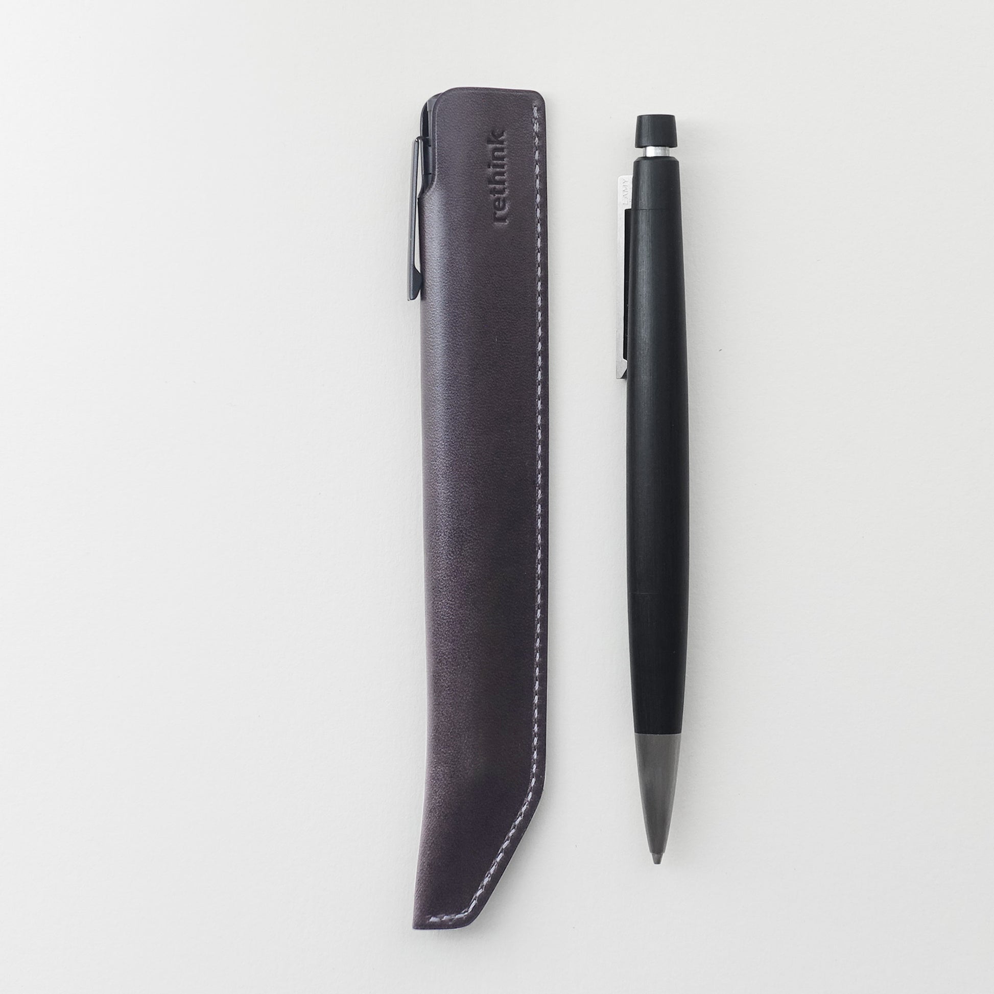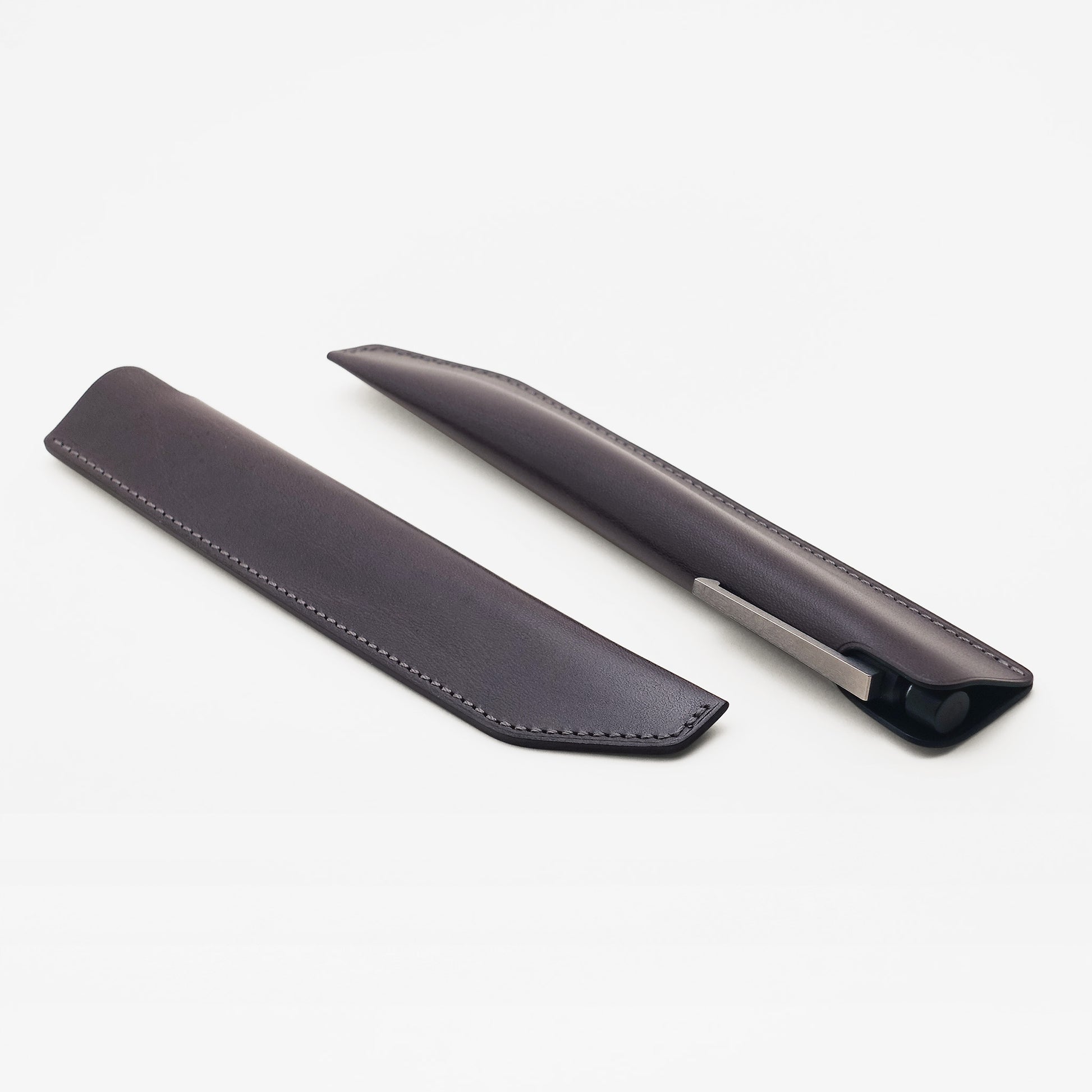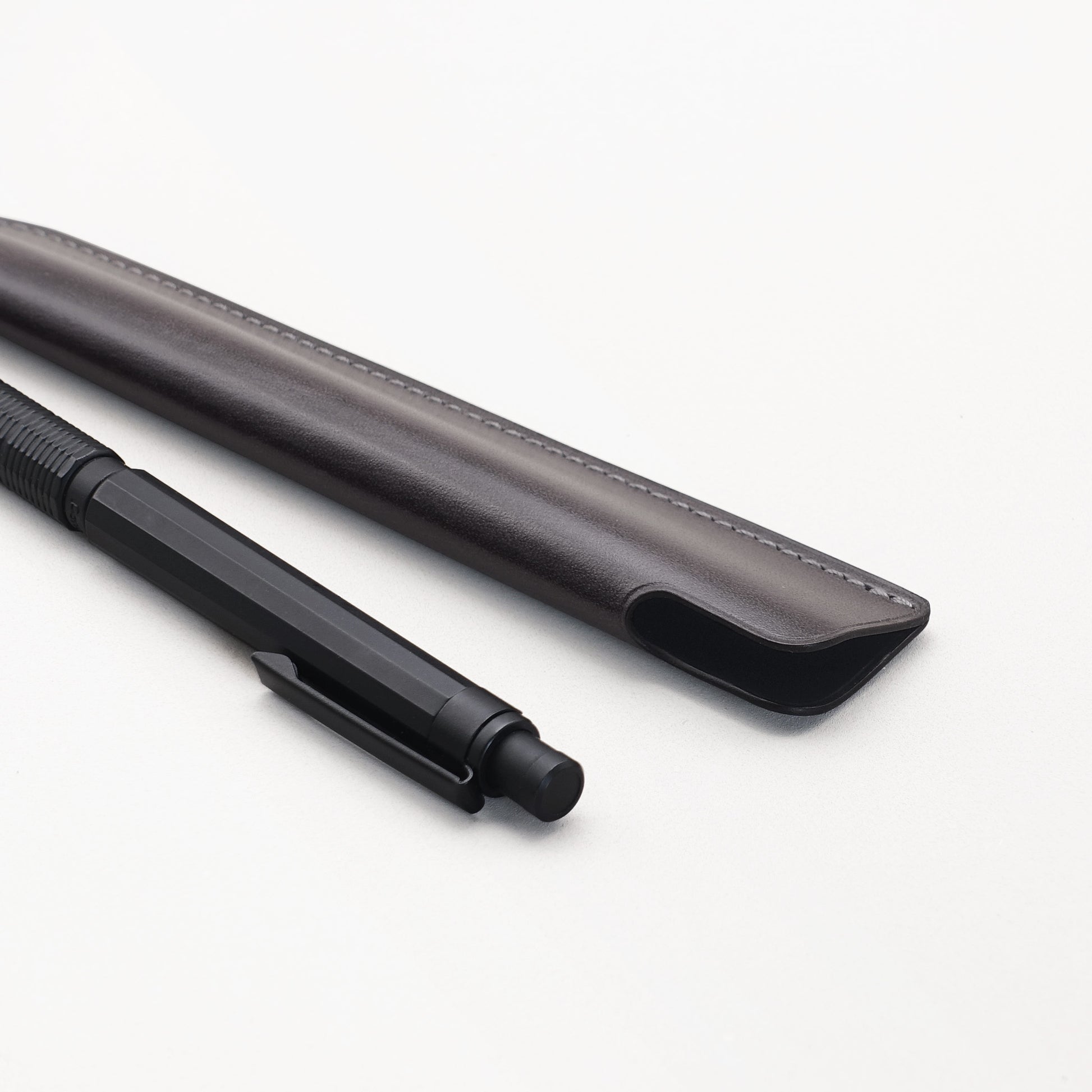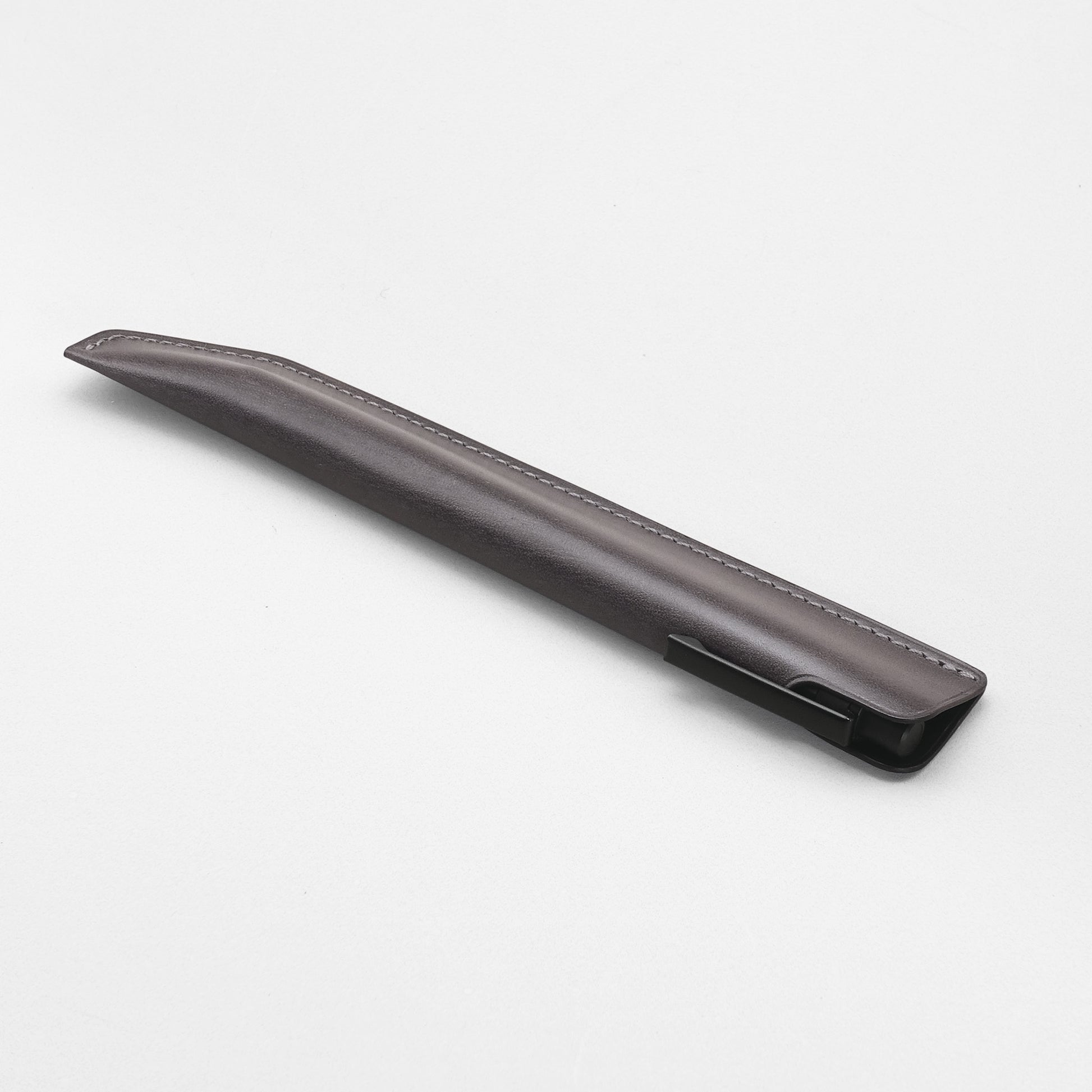 Narrow Pen Sheath は文字通り細軸の筆記具に最適化。一般的な製図用ペンシルなどの繊細な先端ガイドの保護、直径が9~11mmくらいの大切なペンを大きなペンケースにまとめて入れる際に個別に納める、といった使い方を想定したスリムでコンパクトな一本挿し仕様です。ペンのクリップは上部スリットに挟んだりスリーブの中に入れるなど、クリップの形状や好みによって選択できます。