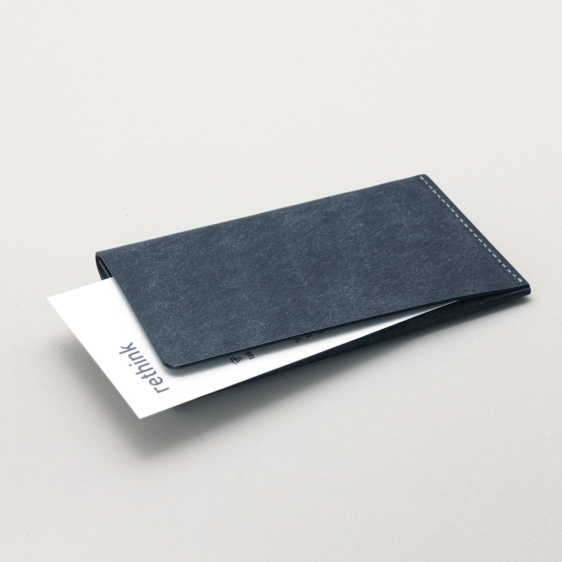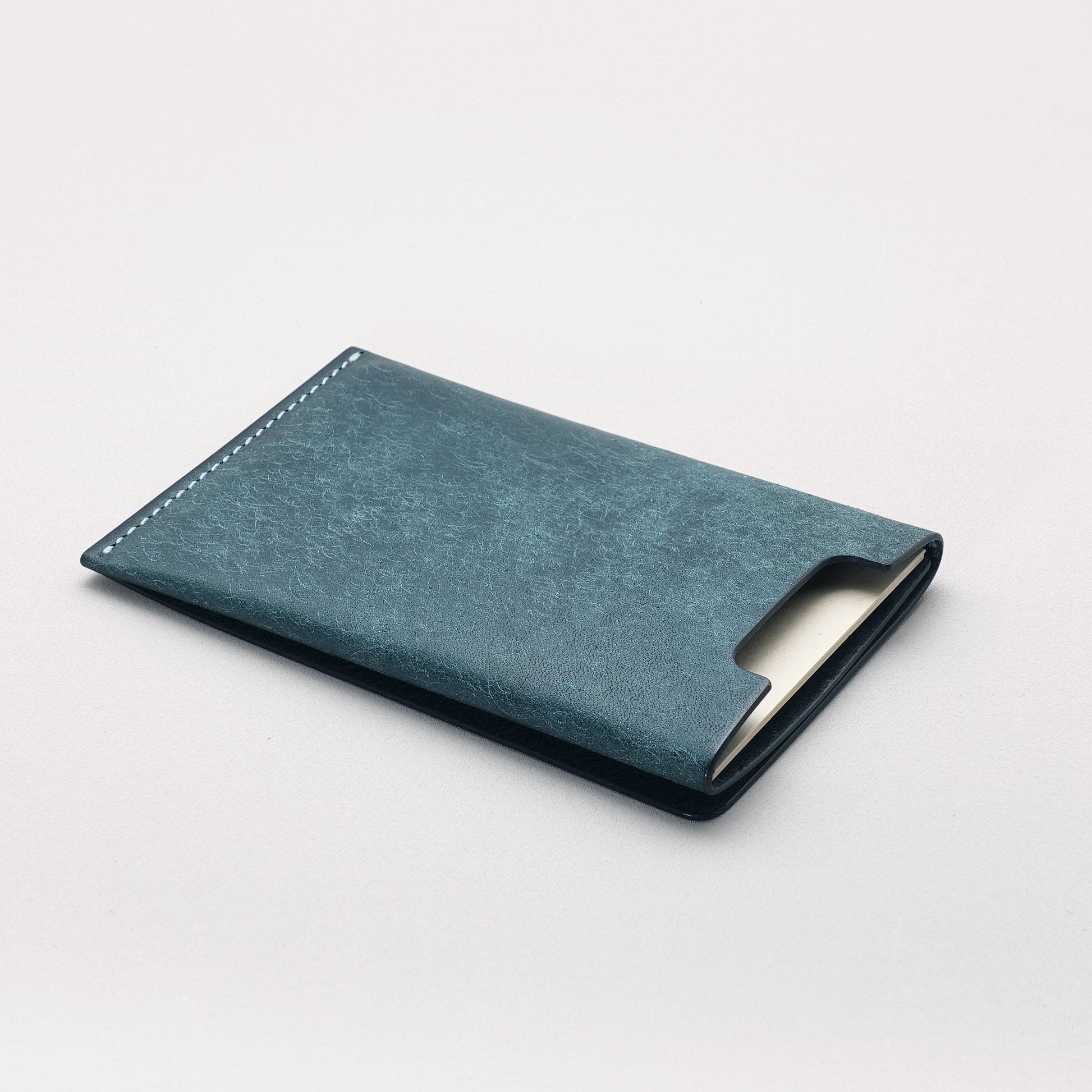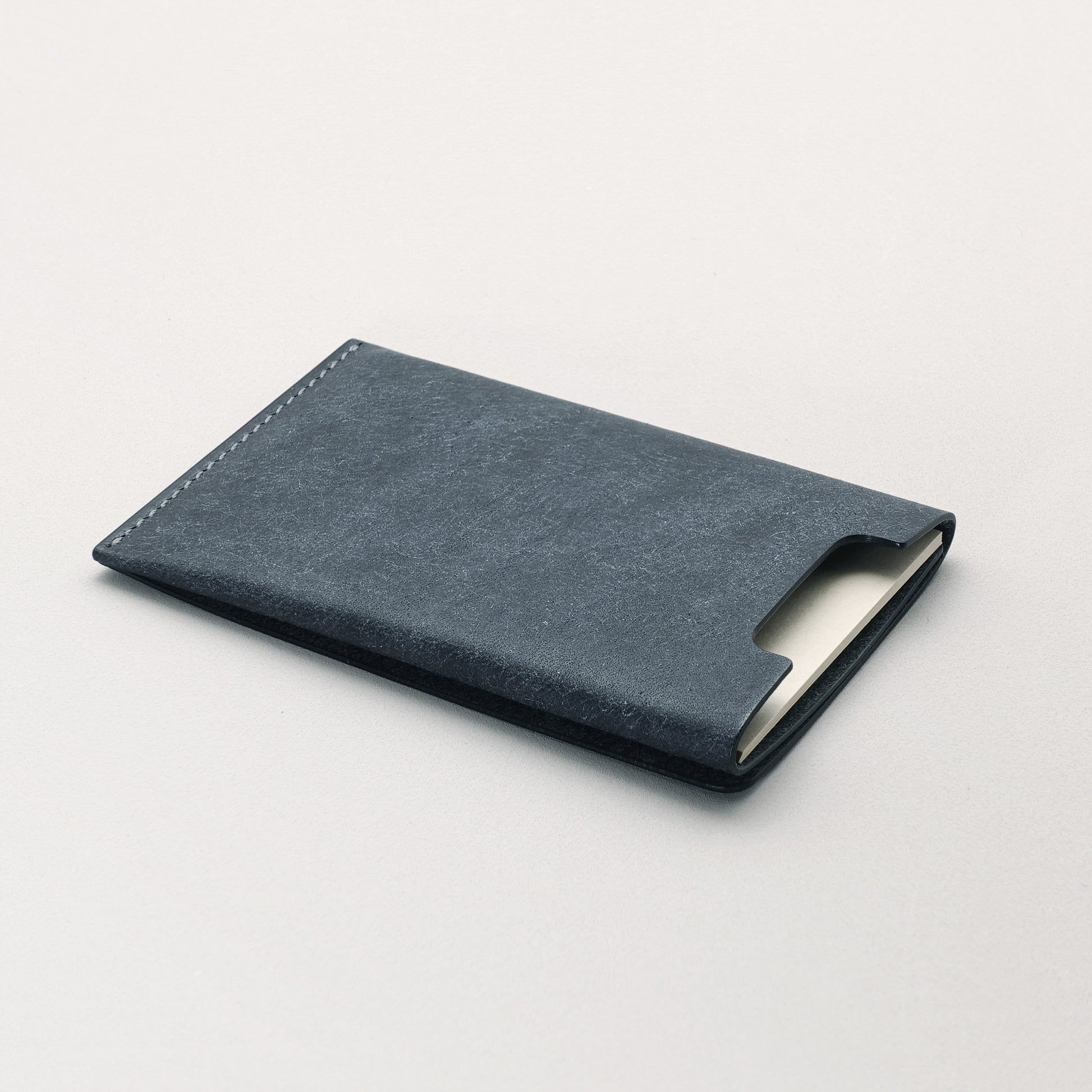 Narrow Sleeveは一枚の裁断パーツを三つ折りにして、一箇所だけを縫い合わせた簡潔なデザイン。カードの出し入れがスムーズなスリーブタイプで、上部のノッチはカードを取り出す際の手掛かりになります。いただいた名刺は会話の合間にさりげなく背面の隙間にという所作。薄型で収納できる名刺は10枚ほど。名刺交換の頻度が少ない方々に最適です。