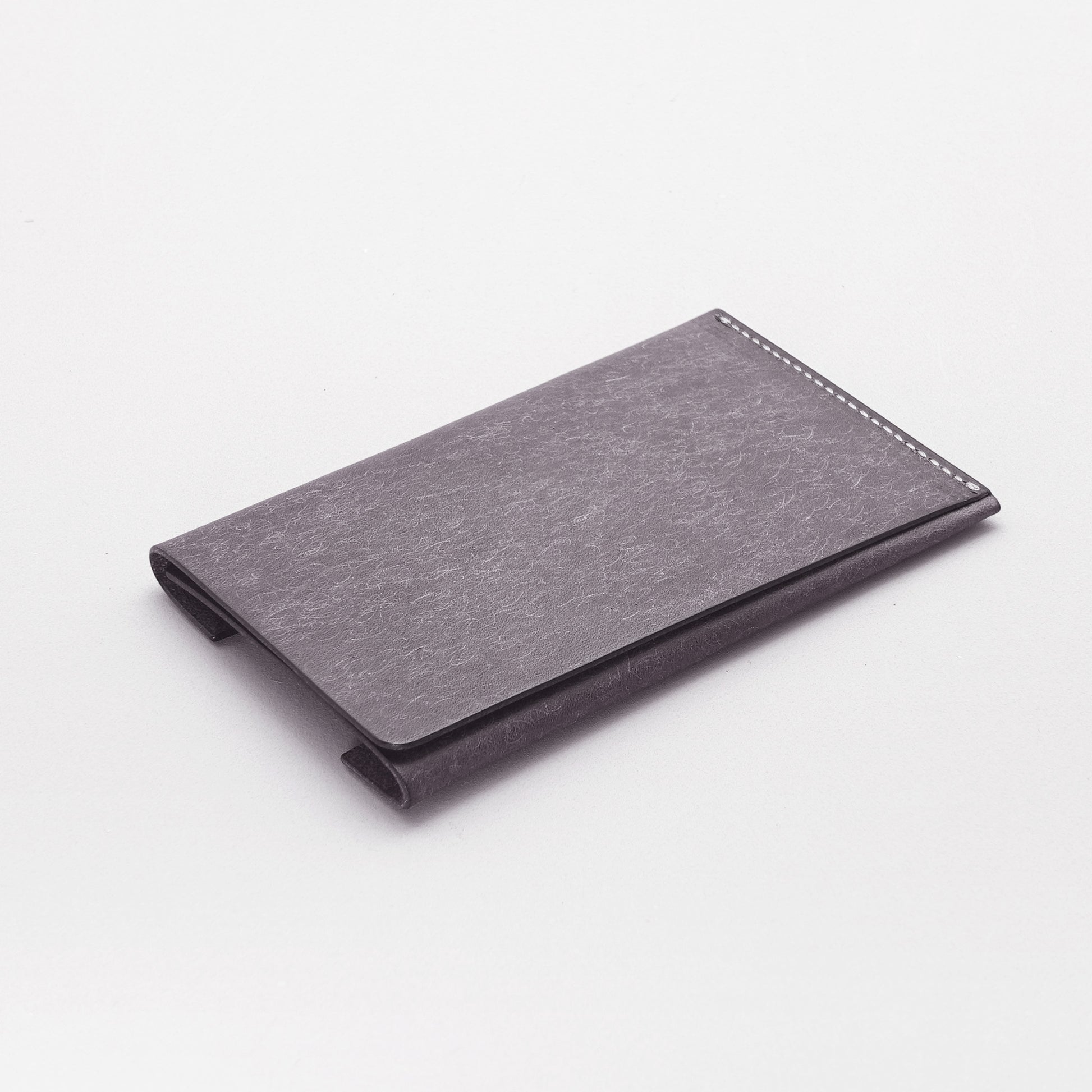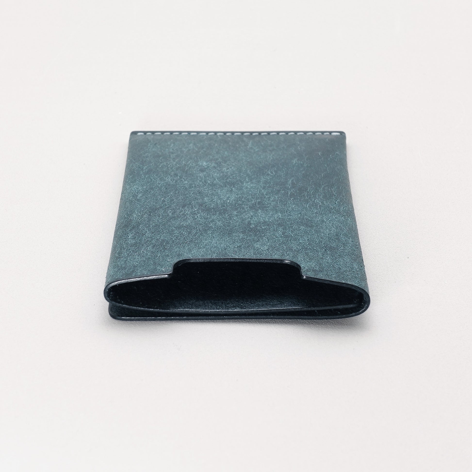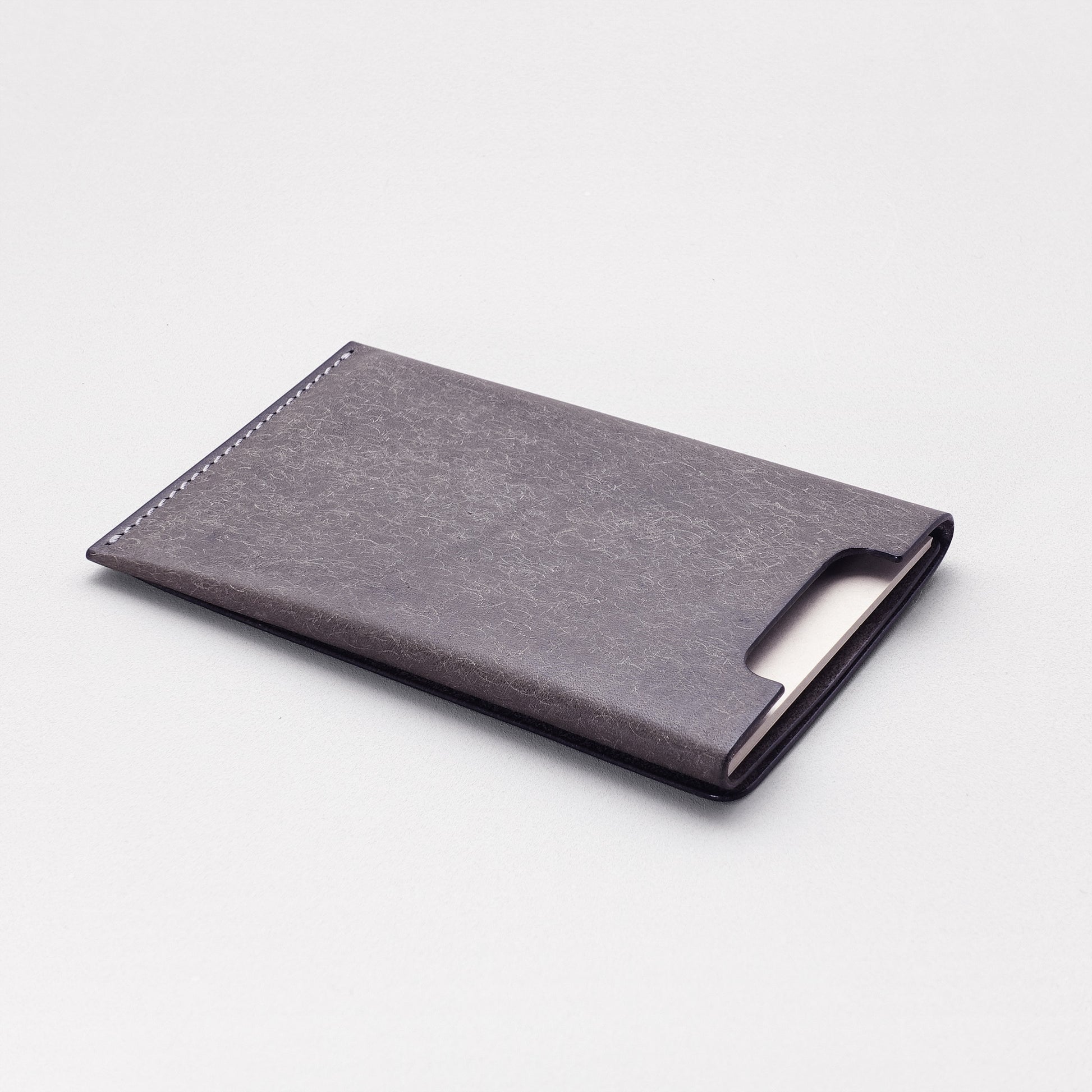 Narrow Sleeveは一枚の裁断パーツを三つ折りにして、一箇所だけを縫い合わせた簡潔なデザイン。カードの出し入れがスムーズなスリーブタイプで、上部のノッチはカードを取り出す際の手掛かりになります。いただいた名刺は会話の合間にさりげなく背面の隙間にという所作。薄型で収納できる名刺は10枚ほど。名刺交換の頻度が少ない方々に最適です。