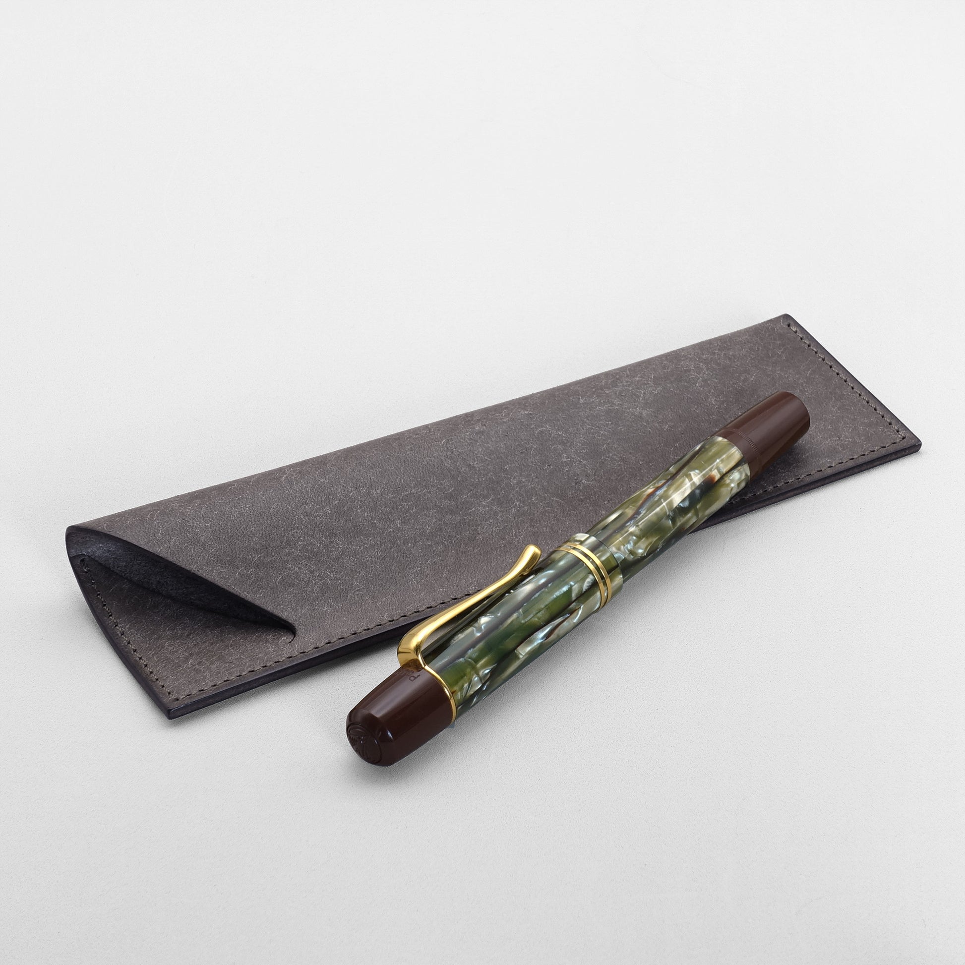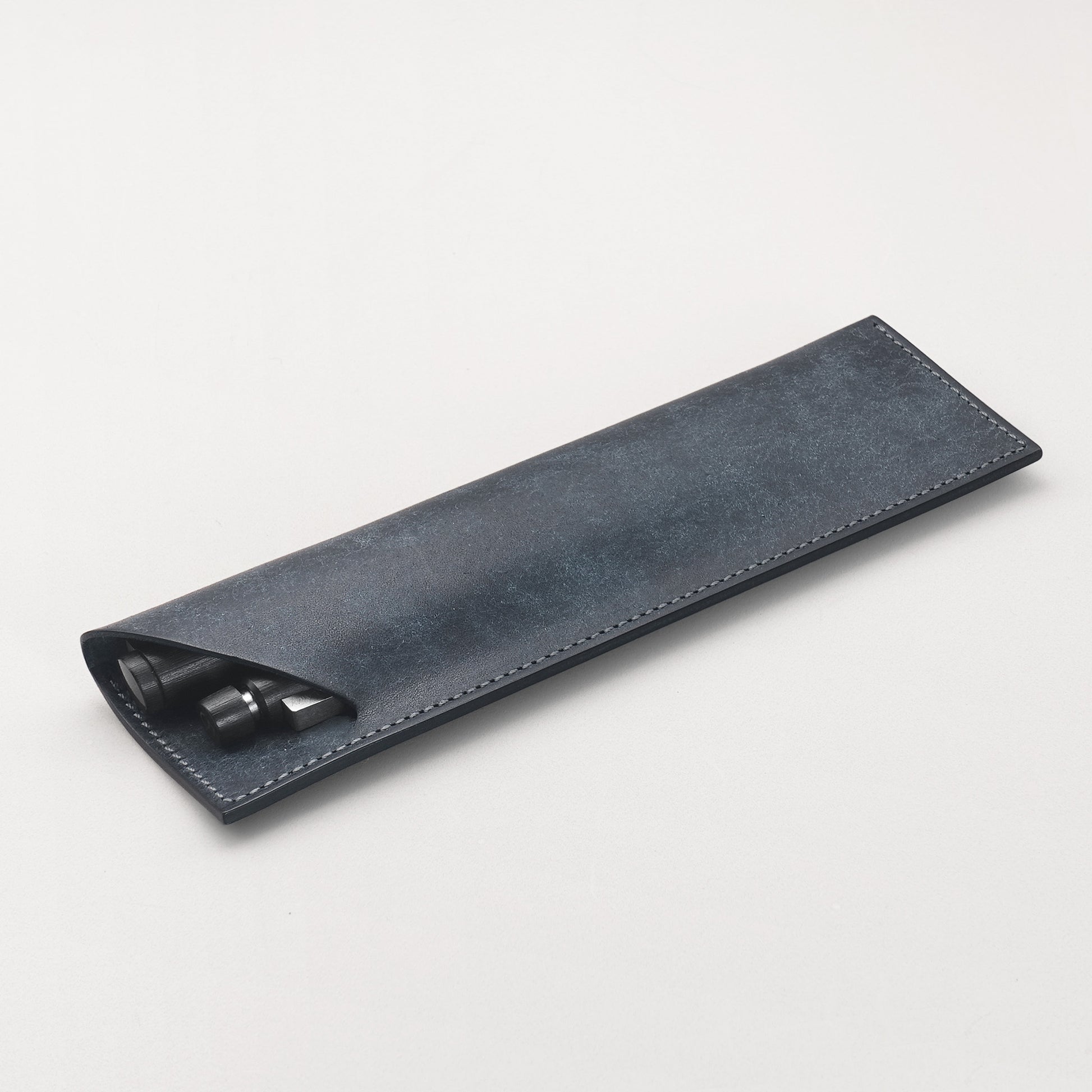 Otemoto は文字通り箸袋の「お手元」から の発想。日常的に見慣れた箸袋を眺めていると「なんとも潔い形」と感じ、ペンシースとしてリデザインするも、普遍的で足すことも引くことも無用。そのものの形が美しく機能的でした。ペンを挿す斜めの切り込みは、一枚革による特性を活かした独自の意匠となっています。