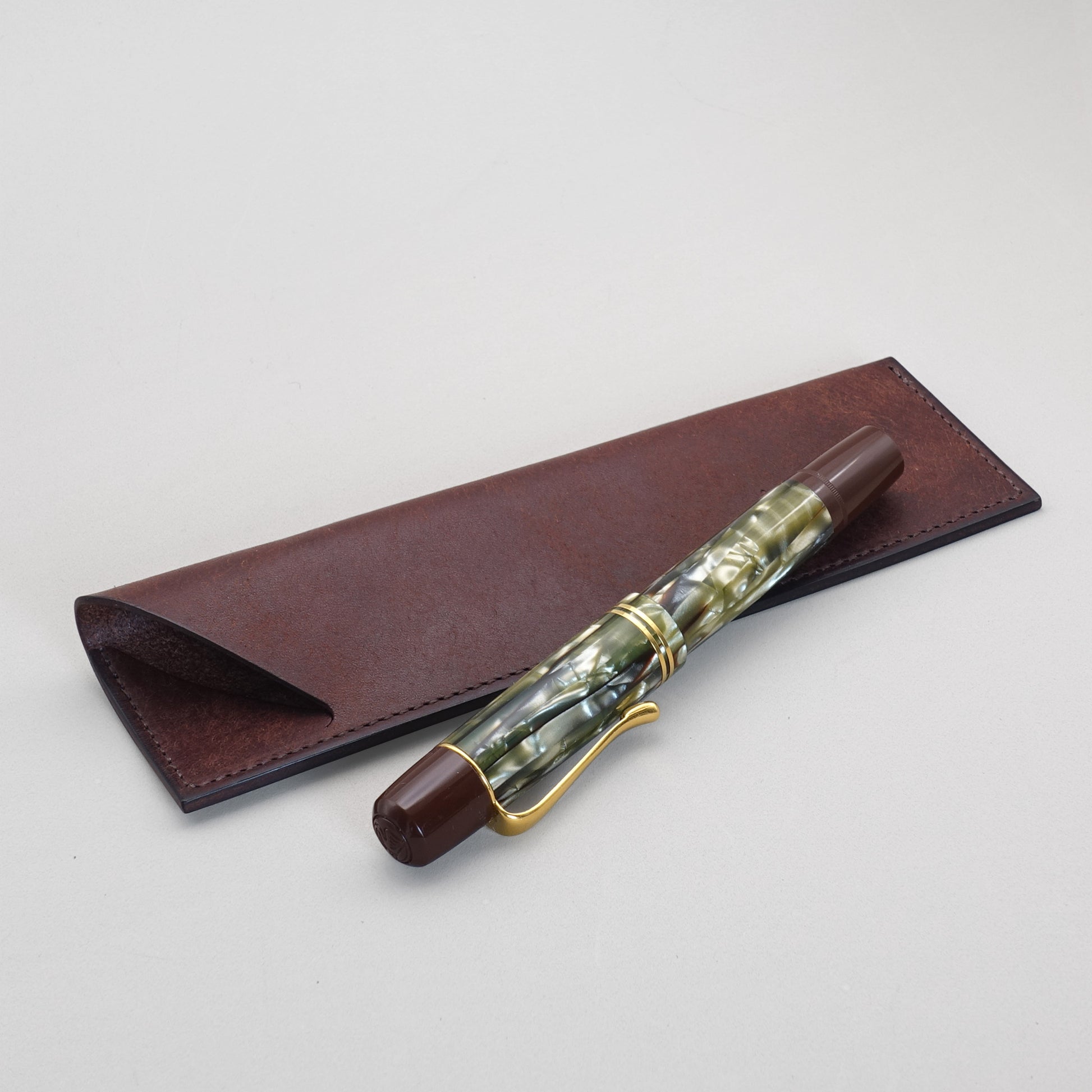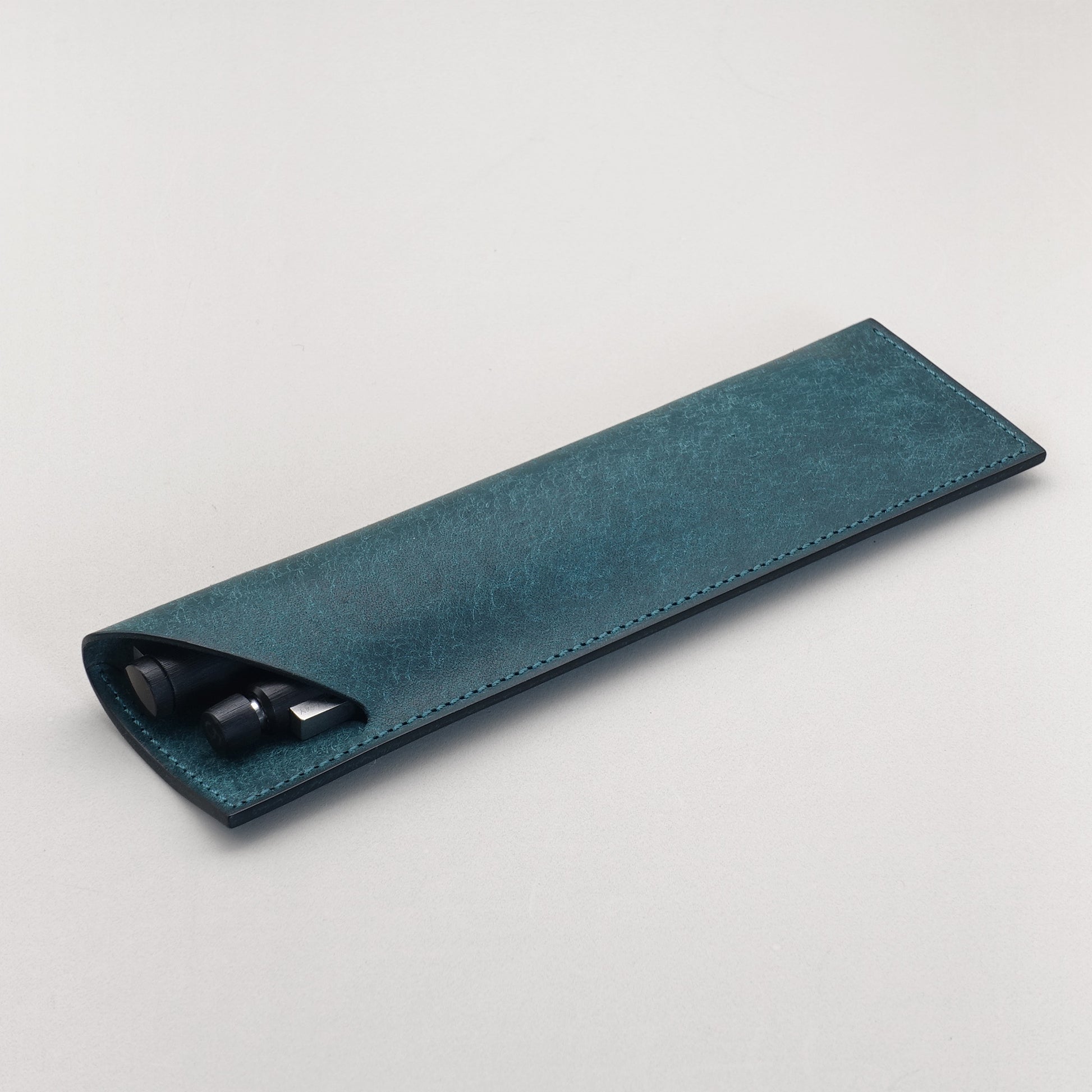 収納できるペンは2本挿しが基本ですが、中仕切りがないので太軸の万年筆なら1本、鉛筆のように細ければ3本まで。ペンの太さや種類、クリップも革に挟んだり中に入れたりと融通無碍。45mm幅のスリムなサイズ感は小さなバッグやポケットの隙間にも収まりが良いです。